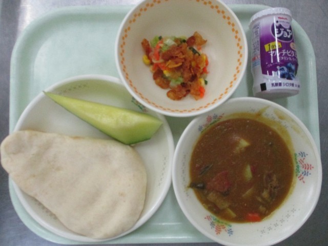 今日のメニューは、【ジョア(ブルーベリー味)、ナン、ゴロゴロ冬野菜カレー、カリカリコーンフレークサラダ、◇くだもの アールスメロン】です。