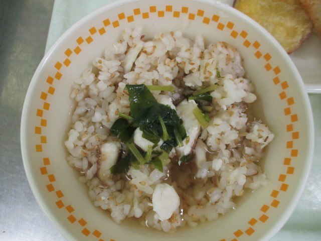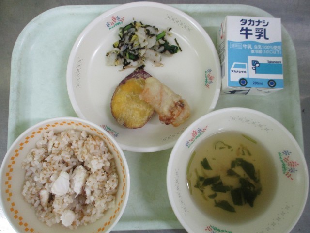 今日のメニューは、【牛乳、鯛めし茶漬け、さつまいもと竹輪の天ぷら、野菜の梅のり和え】です。