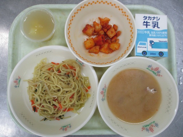 今日のメニューは、【牛乳、◇野菜たっぷりチャーシュー味噌つけめん、スパイシーポテトビーンズ、シャキシャキりんごゼリー】です。