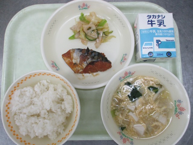 今日のメニューは、【牛乳、ごはん、さばの味噌煮、れんこんの和風ドレッシング和え、むらくも汁】です。