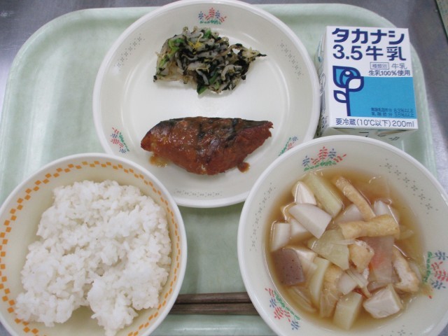 牛乳・ごはん・サバのみそ煮・青菜の磯香和え・具だくさんけんちん汁