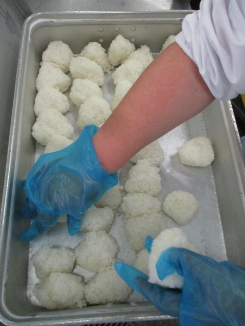 1年生は初めての「ごはん」でした。一人分の量が分かるように、配膳しやすいように1年生だけ「おにぎり」にしています。