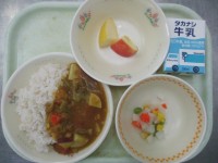 今日のメニューは、【牛乳、チキンライス、お豆とツナのサラダ、ABCスープ、くだもの 巨峰】です。