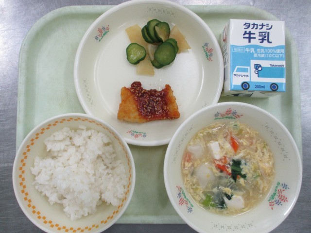 今日のメニューは、【牛乳、ごはん、◇銀だらの西京焼き、青大豆とわかめの和え物、具...