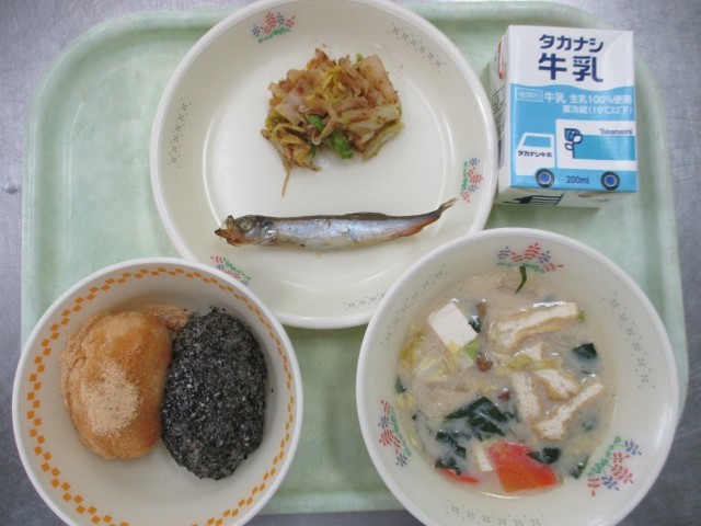 今日のメニューは、【牛乳、◇2色ぼたもち(きな粉&黒ごま)、焼きししゃも、◇春キ...