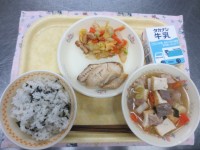 【今日の献立】・牛乳・わかめごはん・ほっけの塩焼き・白菜の煮びたし・のっぺい汁