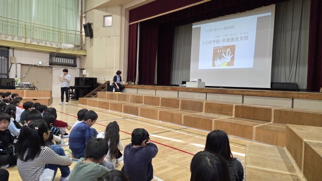 次に生活指導部から、「いじめ予防早期発見月間」の話がありました。いじめを見逃さないように子ども一人ひとりが標語を考えていきます。