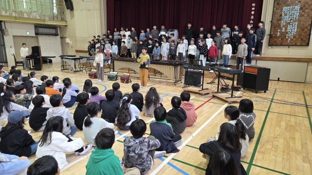 写真は、前日に学校の体育館で行った発表の様子です。本番の演奏を聞くことができない保護者や在校生に聞いてもらいました。