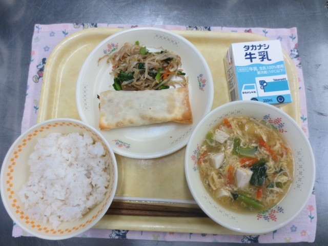 ・麦ごはん・棒ぎょうざ・もやしのピリ辛和え・小松菜とたまごのスープ