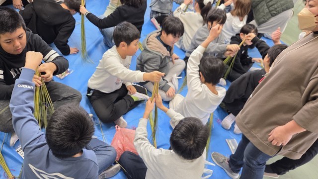 5年生が自分たちで育てたお米の稲わらを使って、お正月のしめ縄飾りを作りました。