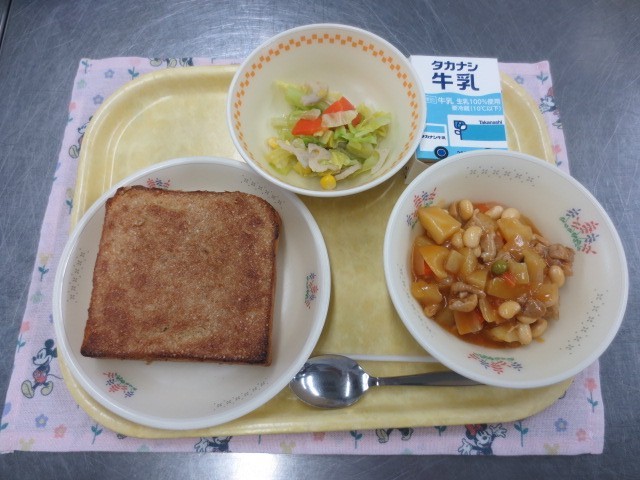 牛乳・セサミトースト・バジルドレッシングサラダ・チキンビーンズ