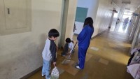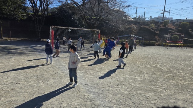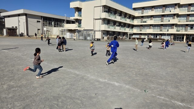 子供たちは、お兄さんお姉さんが来てくれたことで大喜び。休み時間鬼ごっこをしてニコニコ。給食を一緒に食べてニコニコ。