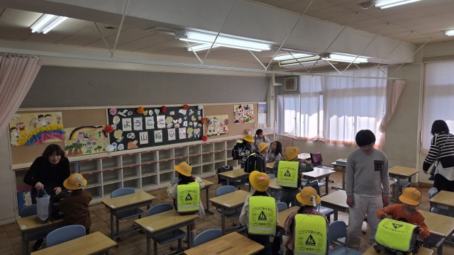 まだ学校に慣れていない1年生を6年生が優しくお世話しています。