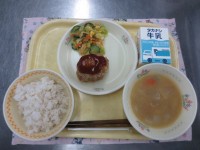 【今日の献立】・牛乳・ごはん・れんこんバーグ・ツナみそサラダ・根菜のみそ汁