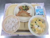 【今日の献立】・牛乳・ごま塩ごはん・豆あじのからあげ・小松菜とコーンの和え物・塩...
