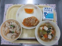 【今日の献立】~宮城県の郷土料理~・牛乳・はらこ飯風・笹かまといもの天ぷら・きの...