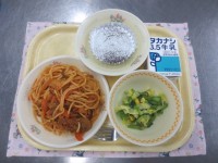 【今日の献立】~リクエスト給食~・牛乳・ミートソーススパゲッティ・玉ねぎドレッシ...