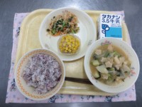 【今日の献立】・牛乳・コーン入りわかめごはん・ししゃものパン粉焼き・揚げ玄米のサ...