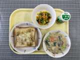 今日の給食は、じゃこチーズトースト・小松菜サラダ・秋野菜の豆乳シチュー・発酵乳...