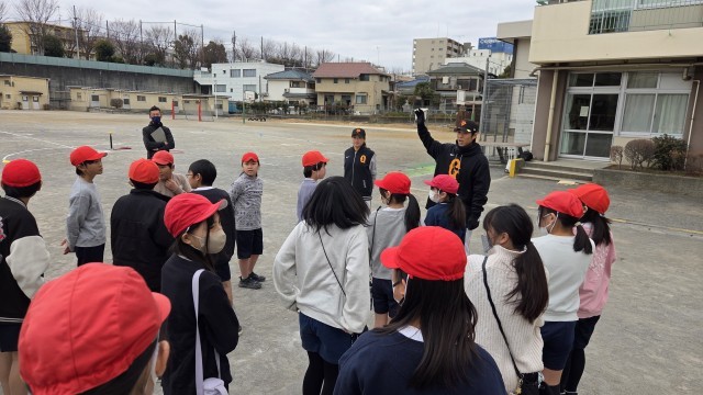 ジャイアンツアカデミーのコーチや女子チームの選手が来て、6年生に野球の基本を教え...