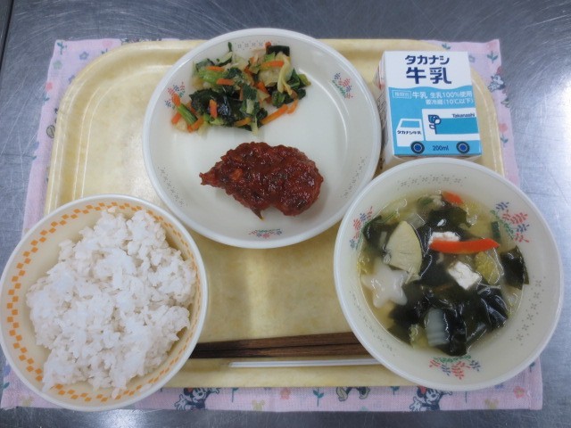 【今日の献立】・牛乳・麦ごはん・ヤンニョムチキン・野菜のみぞれ和え・ミョック