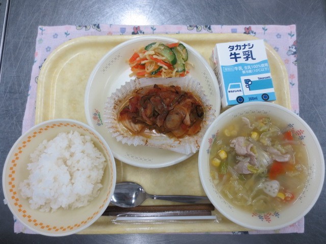 【今日の献立】~東京都の給食~・東京牛乳・ごはん・たこぺったん・野菜のさっぱり和...