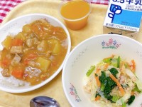 ホイコーロー丼、のり塩粉ふきいも、中華風たまごスープ、牛乳