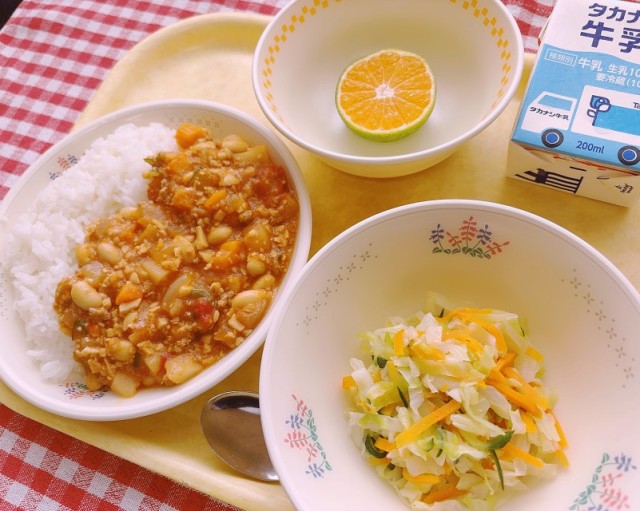 チリコンカンライス、コールスロー、青みかん、牛乳