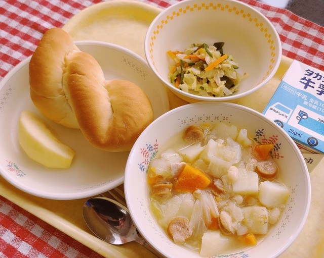 ツイストパン、ポトフ、わかめサラダ、りんご(秋映)、牛乳