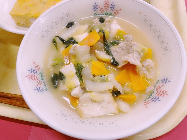 ほくほくと甘い栗ご飯は、秋の代表的なごちそう。出汁のよく効いたジューシーなたまご焼きも食べ応え抜群です。野菜のおかか和えは、かつお節の香りで野菜がよりおいしく。大豆と野菜が入った呉汁(ごじる)は、たんぱく質や食物せんいが豊富で、体をあたためてくれます。秋の恵みに感謝しながら、しっかりいただきましょう。