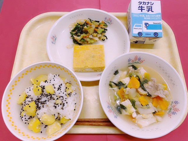 栗ご飯、たまご焼き、野菜のおかか和え、呉汁