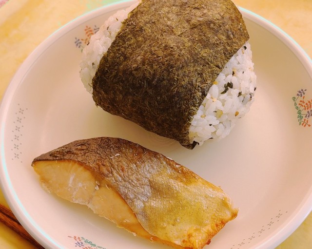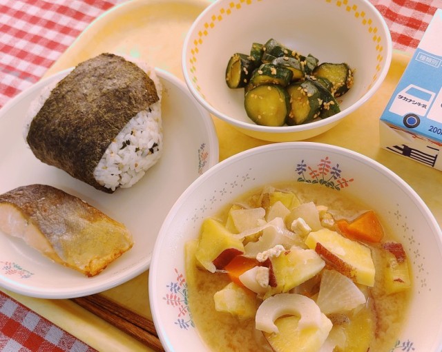 わかめおにぎり、ますの塩焼き、きゅうりのスタミナ漬け、さつま汁、牛乳