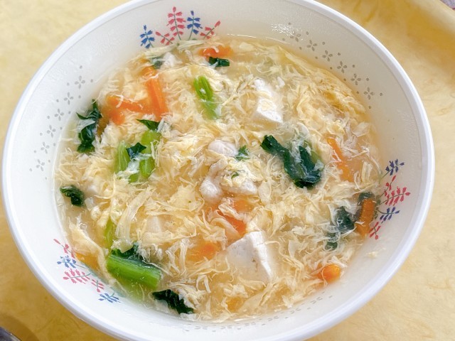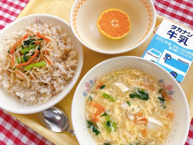 ビビンバ(まぜごはん、・ナムル)、たまごスープ、みかん、牛乳