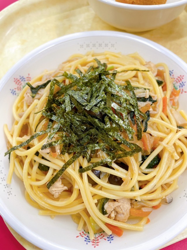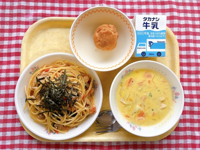 しょうゆとバターの香りが広がる「きのこ和風スパゲティ」で秋の味覚を満喫し、やさしい「コーンスープ」と、給食室で一つ一つ揚げた「手作りドーナツ」で心も体もほっこり温まります。