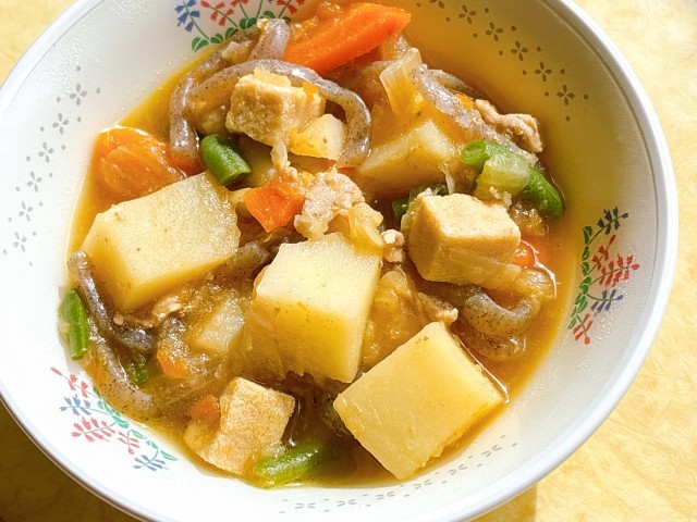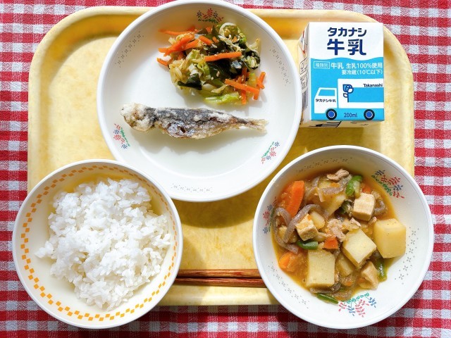 肉じゃがは、日本の家庭料理の定番です。じゃがいもやにんじん、たまねぎなどの野菜を、肉といっしょに甘辛く煮てあります。体をあたため、栄養満点の献立です。