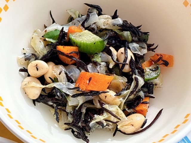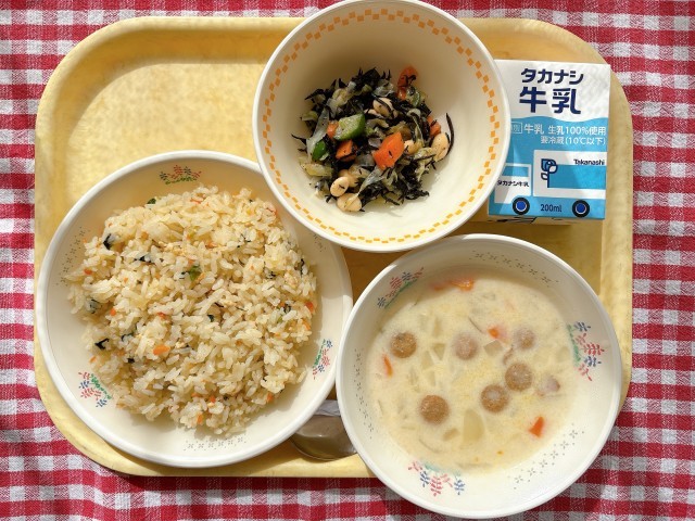 小松菜のピラフ、大豆とひじきのサラダ、クラムチャウダー、牛乳 他