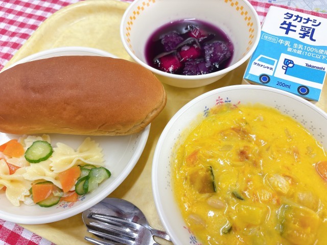 今日はかぼちゃやハロウィーンをイメージするような彩りのメニューにしたので、みなさん楽しんで食べてくださいね。