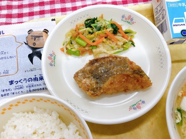 国宝土偶にそっくりで知られる町田市指定有形文化財「中空土偶頭部」をモデルにした、まちだ縄文キャラクター「まっくう」を使った給食です。