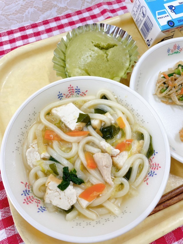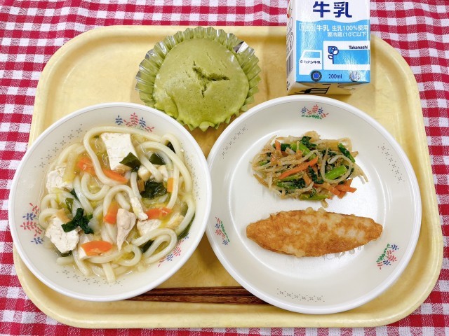 わかめうどん、笹かまぼこの天ぷら 野菜の胡麻和え、抹茶蒸しパン、牛乳