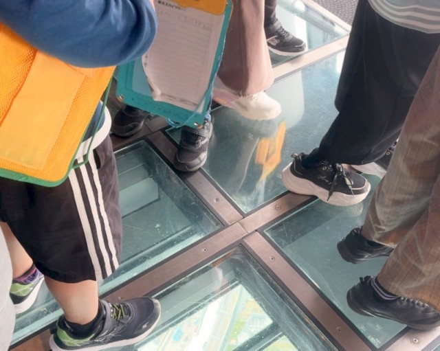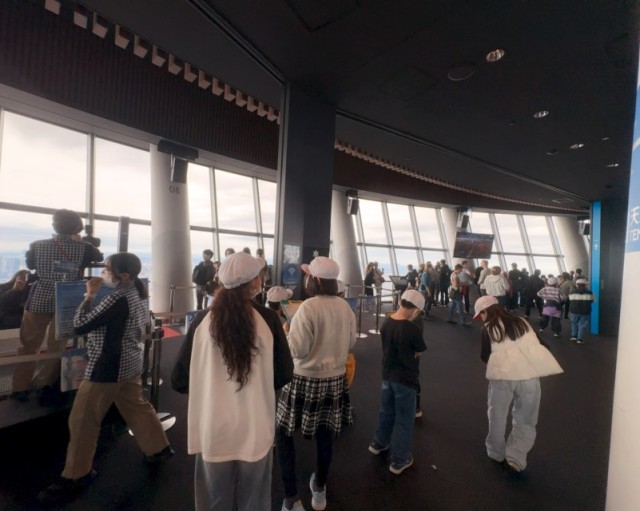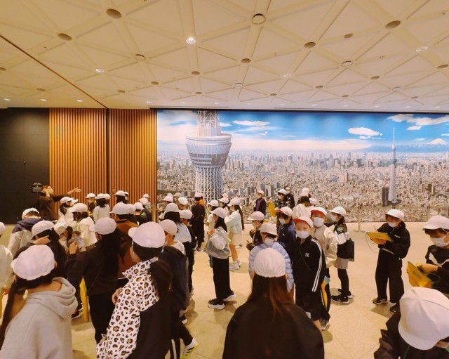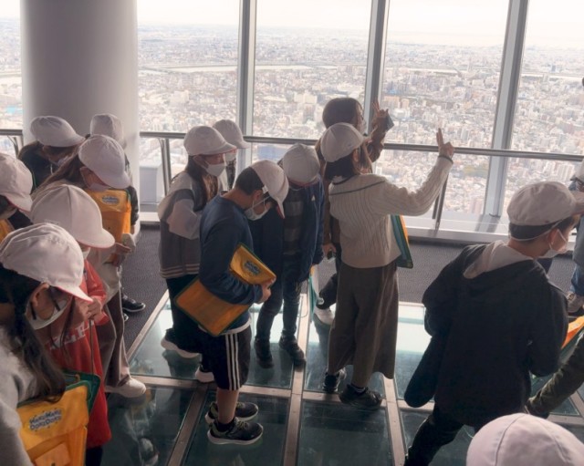 スカイツリーの高さはご存知634(むさし)メートル。本日みんなでのぼる展望デッキの高さは350メートルに位置します。約50秒の高速エレベーター、ドアが開くとそこには東京を一望できる景色が広がっていました。