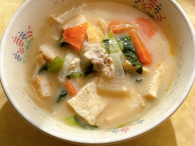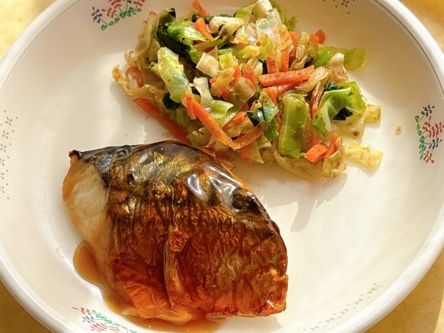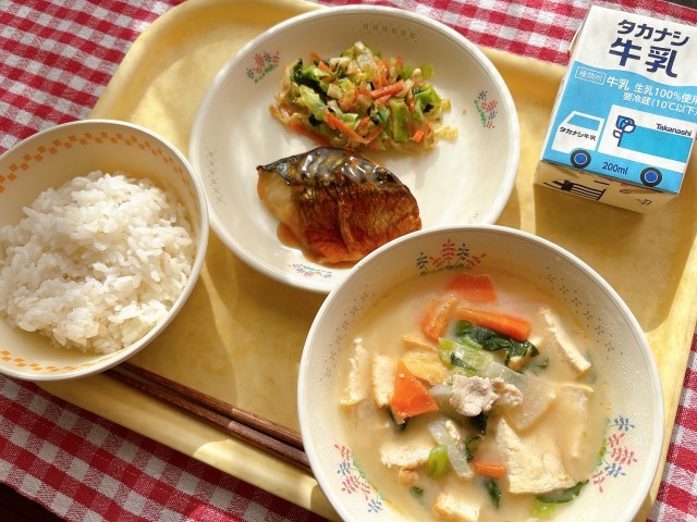 さばの照り焼きは、しょうゆとみりんと砂糖の香ばしい味がご飯によく合う人気のメニューです。おひたしは野菜本来のうま味を味わえる和の副菜。呉汁は、すりつぶした大豆(呉)を使った昔ながらの郷土料理で、成長に必要なたんぱく質が豊富です。