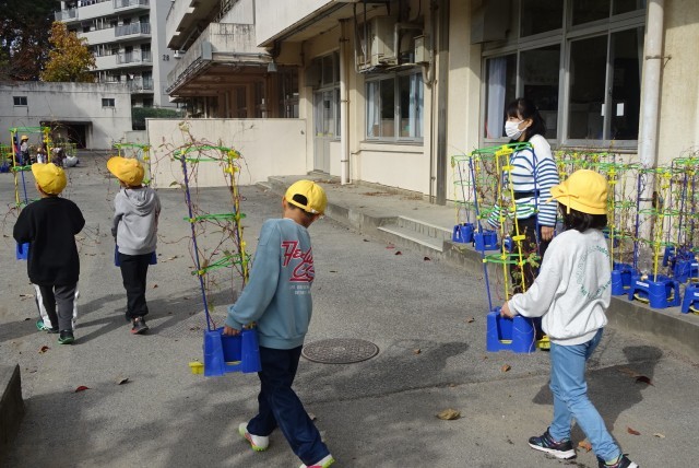みんなで「ありがとう」の気持ちを込めて、花が咲き終り乾燥したつるをそっと抜き取って集めました。春から夏にかけて、毎日の水やりや観察を通して、1年生にたくさんの気づきと学びをくれたあさがお。そのつるは、これから何か素敵な工作に生まれ変わるかもしれません。