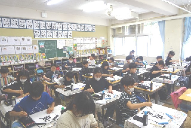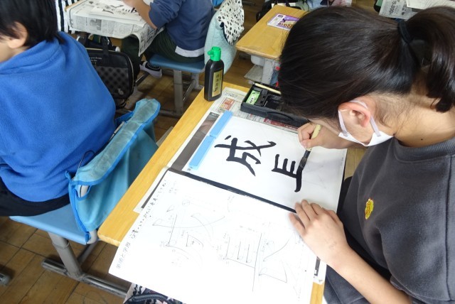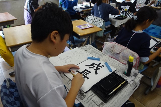書写の授業で、5年生が「成長」という字に挑戦しました。半紙に向かう姿はとてもまじめで、教室には集中した、心地よい緊張感が漂っていました。