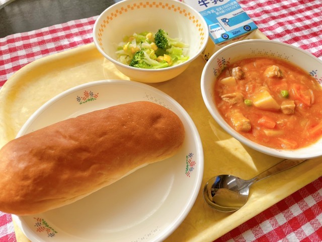 ミルクパン、トマトシチュー、ブロッコリーサラダ、牛乳