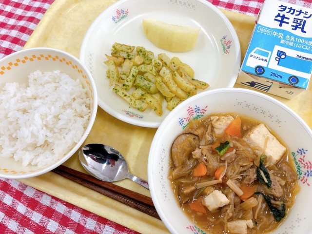 「すき焼き」は江戸時代から親しまれてきた日本の料理です。本来は牛肉を使いますが、給食ではうま味のある豚肉を使って食べやすくアレンジしています。しょうゆやさとうの甘辛い味が具材によくしみ込み、ごはんがすすむ一品です。