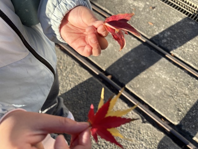 秋のお土産は色づいた落ち葉や大きな葉っぱ。