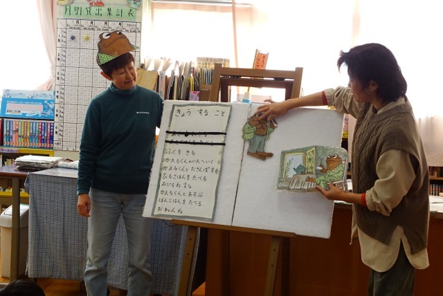 図書指導員のY先生とSSS(スクールサポートスタッフ)のI先生のコンビが2年生に向けてパネルシアターを演じてくれました。