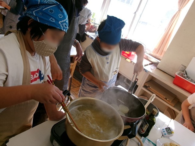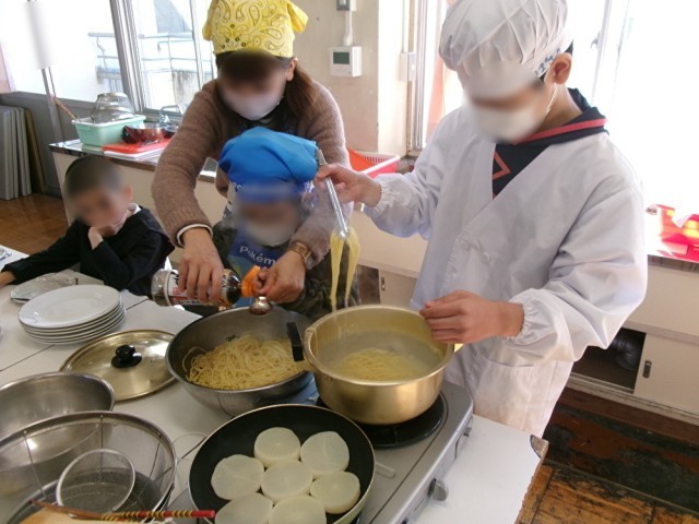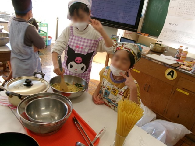 つばさ学級で調理会をしました。献立は、小松菜とツナの和風パスタ、野菜のミルクスープ、大根のステーキチーズのせです。たてわりで班を作り、高学年が低学年をリードしながら調理を進めました。高学年は包丁や火を使った調理にも慣れており、落ち着いて取り組んでいました。この日は給食を止め、献立だけでなく、使う野菜も含めてすべて自分たちで考えた「ベジクエ」として実施しました。とてもおいしく仕上がり、片付けまで自分たちで行うことができました。