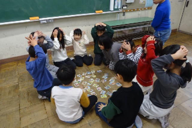 今日はいろいろなクラスでお楽しみ会をしていました。3年生のこのクラスカルタをしていました。頭に手を乗せて待っているのが可愛いですね。