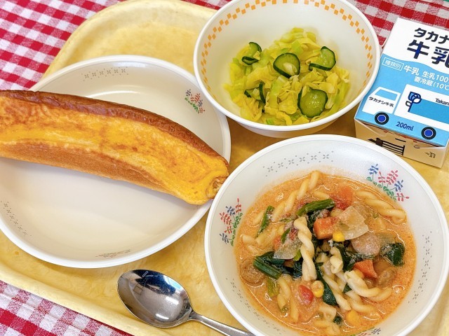 フレンチトースト、キャベツのレモンあえ、トマトと豆乳のパスタスープ、牛乳